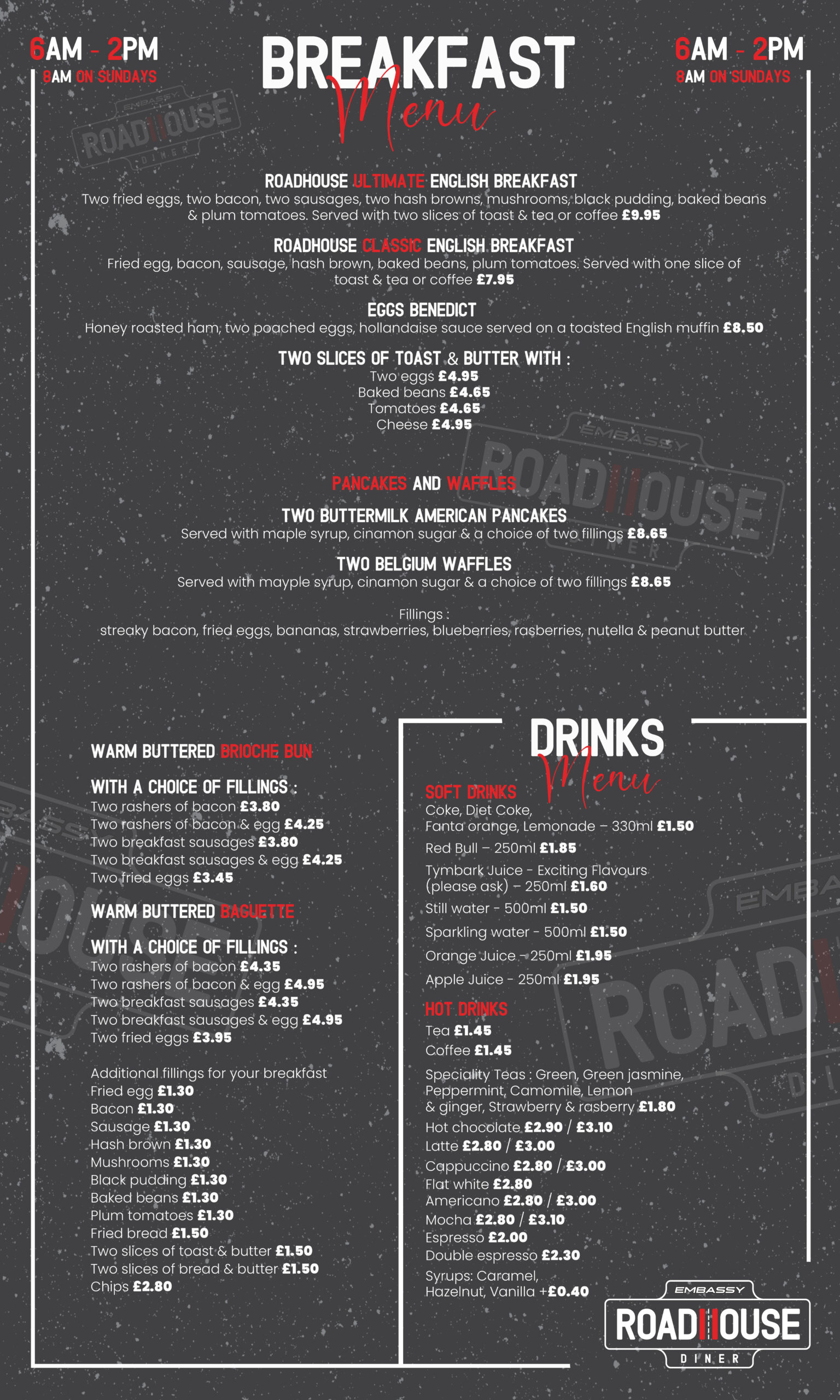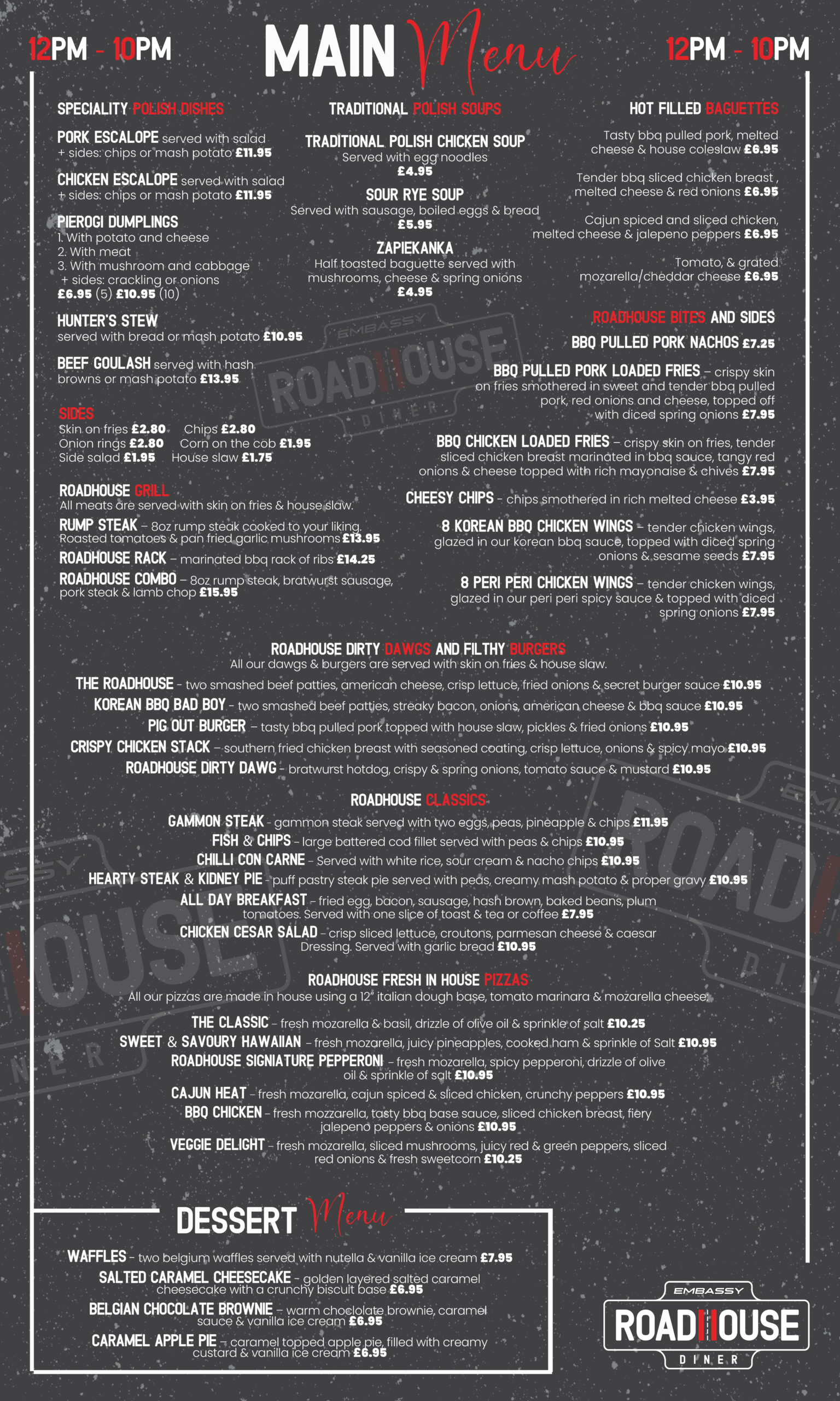 Whether you're in the mood for a quick bite or a hearty feast, we’ve got everything from all-day breakfasts and burgers to fresh pizzas and unique Polish specialities. Indulge in our signature loaded fries, comforting British classics, and decadent desserts. With a dish for every craving, The Roadhouse Diner is the perfect stop to refuel and enjoy great food at any time of day.